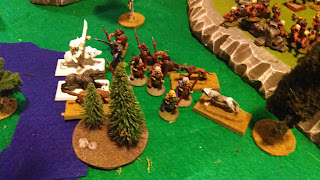 I entered 12 wargs on the west edge to cut off the Elven advance. Once again, though, I couldn't resist jumping on them, especially the archers. With more wargs heading for the head pf their column, I reasoned it was better to go after their archers to keep them from harassing the left flank of the main assault. Eventually we killed a bunch, actually causing a Courage Test, but more importantly, we just kept engaging them do they couldn't shoot. (Troops already engaged in melee combat need not take the Courage Test, so though we forced one, all the Elves were engaged and never took one.)